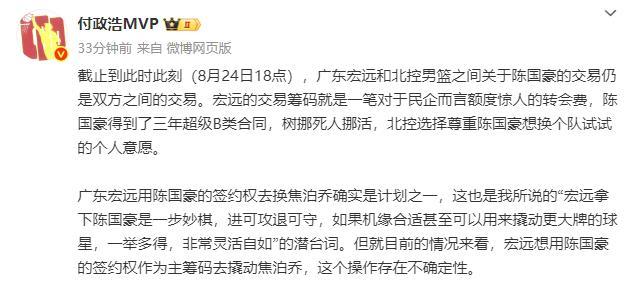 广东男篮今夏在内线补强态度上非常坚决,经过朱芳雨的多番接触之后,最终通过交易从北控男篮引进了陈国豪。媒体人“付政浩”表示,广东宏远和北控男篮之间关于陈国豪的交易仍是双方之间的交易,宏远的交易筹码就是一笔对于民企而言额度惊人的转会费,陈国豪得到了三年超级B类合同,北控选择尊重陈国豪想换个队试试的个人意愿。据悉,广东男篮用一笔超过千万的转会费从北控手中换来了陈国豪的签约权,至于三方交易,是广东男篮拿到陈国豪签约权之后,希望用陈国豪和年轻球员从广州队换来焦泊乔,不过从目前的情况看,这笔交易能否完成还存在着较大的不确定性。